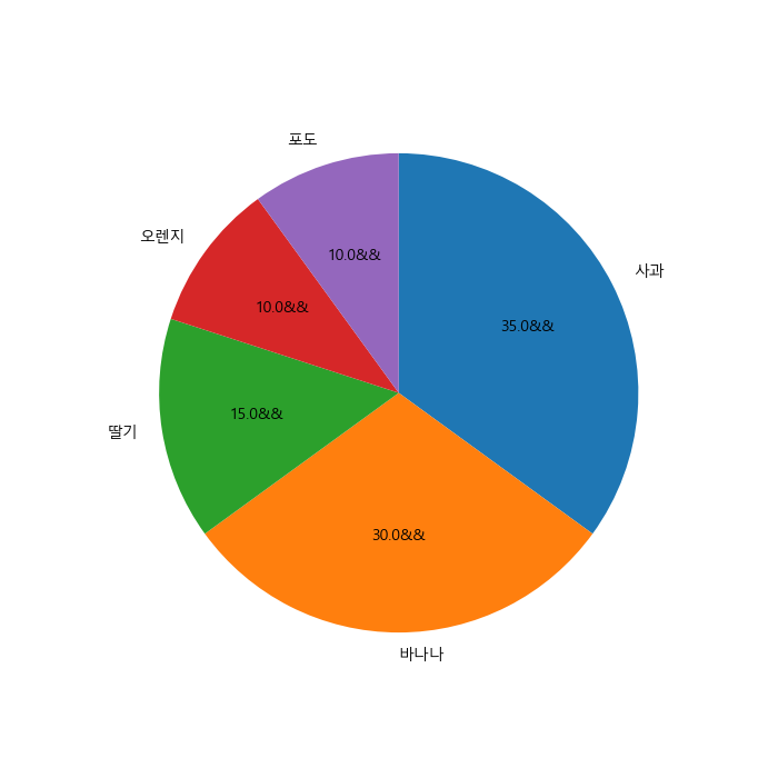 plt.pie(result, labels=fruit, autopct='%.1f&&', startangle= 90, counterclock=False)