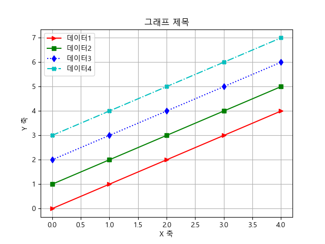 plt.legend(['데이터1', '데이터2', '데이터3', '데이터4'], loc='best')