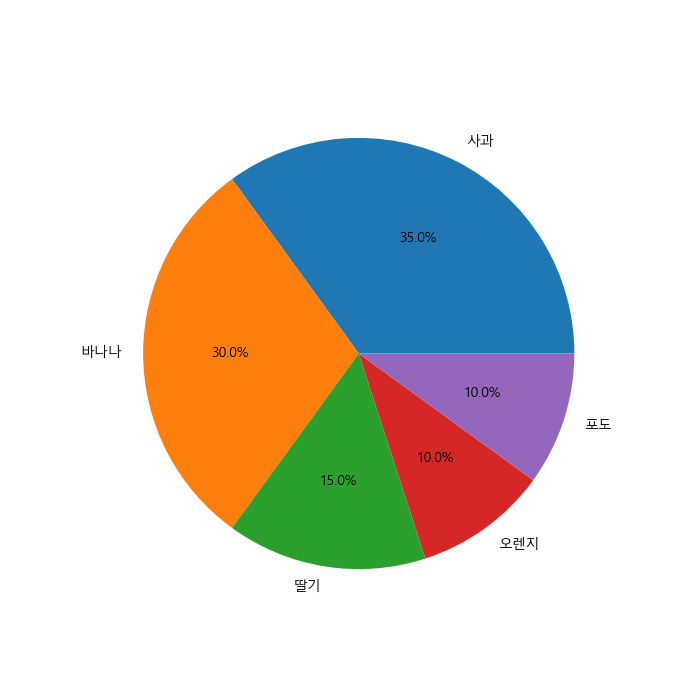plt.pie(result, labels=fruit, autopct='%.1f%%')