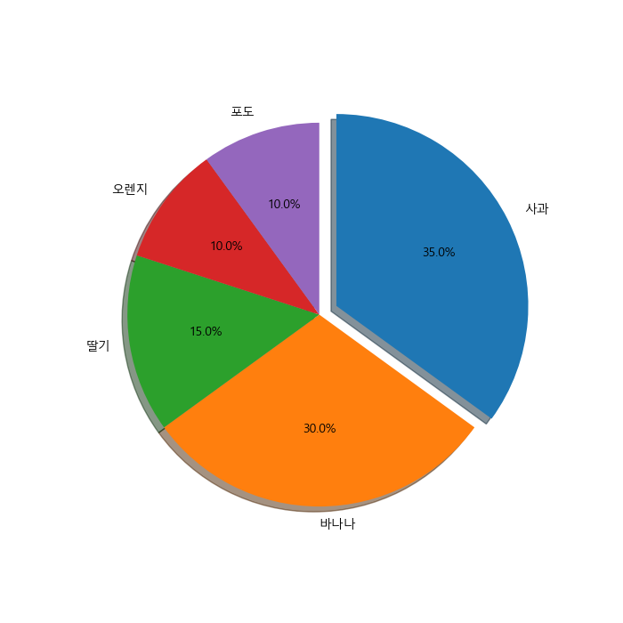 # 그림자를 추가하고, 특정 요소(사과)를 표시한 부채꼴 부분만 강조한 예