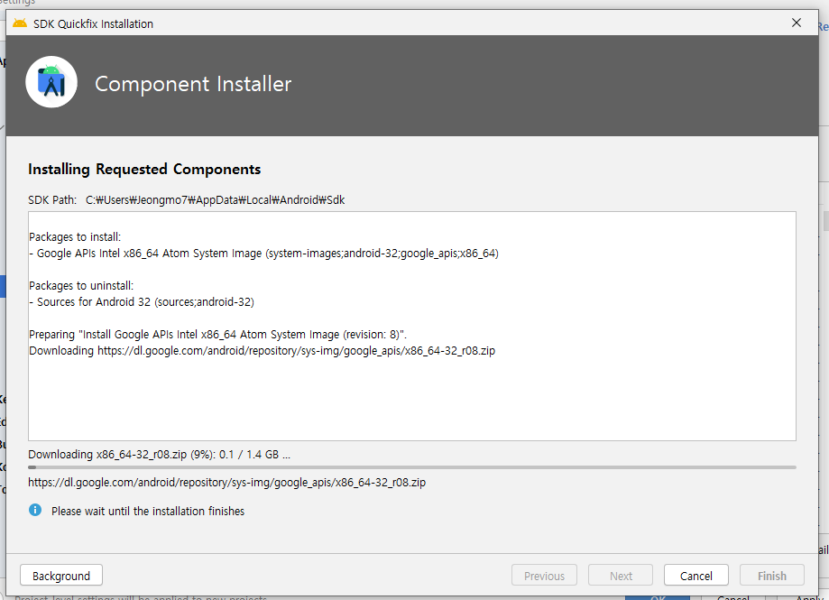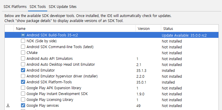 - SDK Tools > Google Play services > 둘 다 설치