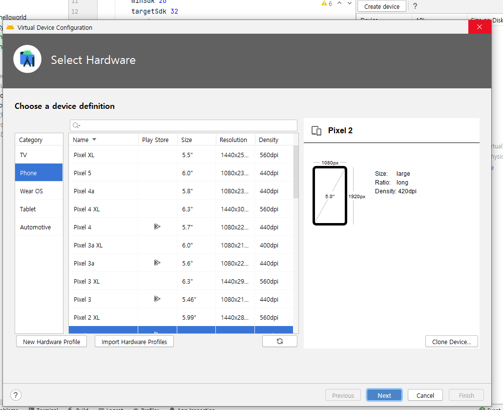 - Create device > Pixel 2 선택 > Next