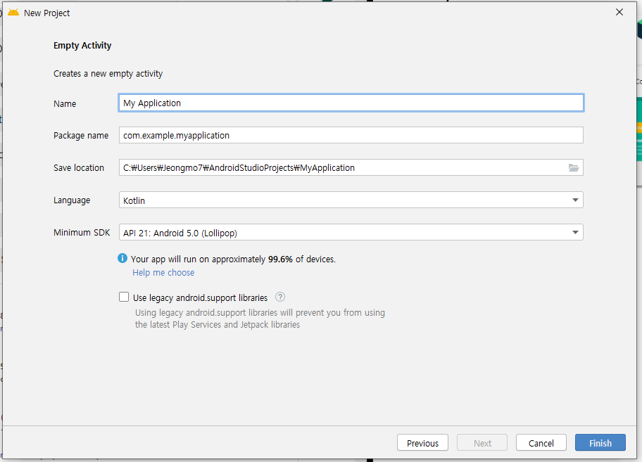 - Minimum SDK : 만드는 앱이 작동하는 최하 버전을 선택