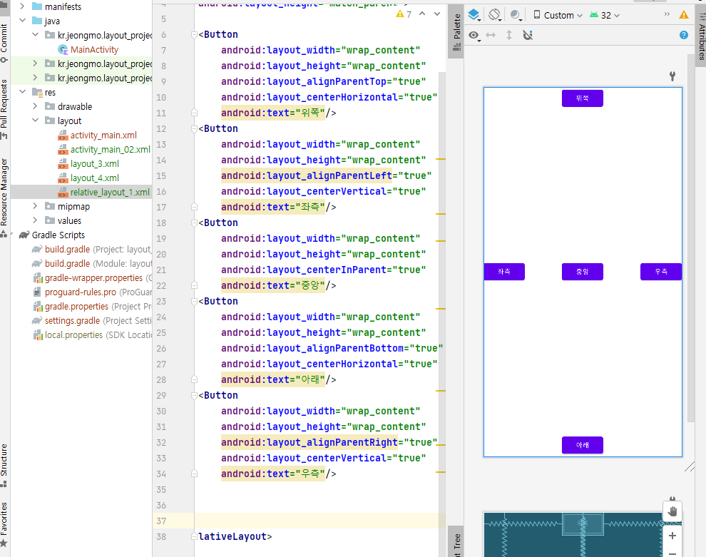 - 위젯 자신이 속한 레이아웃의 상하좌우 위치를 지정하여 배치하거나 다른 위젯으로부터 상대적인 위치를 지정