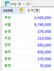 SELECT NAME, popu * 10000 AS "인구(명)" FROM tcity;