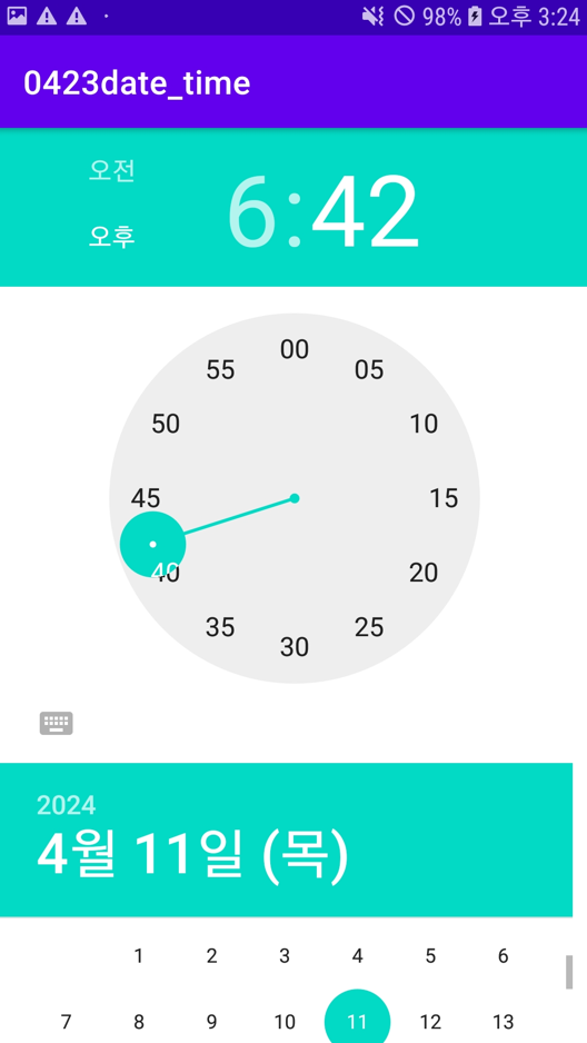 Android (아날로그 시계, 디지털 시계, 크로노미터, 타임피커, 데이트피커, 캘린더뷰, 예약 시스템 프로그램)