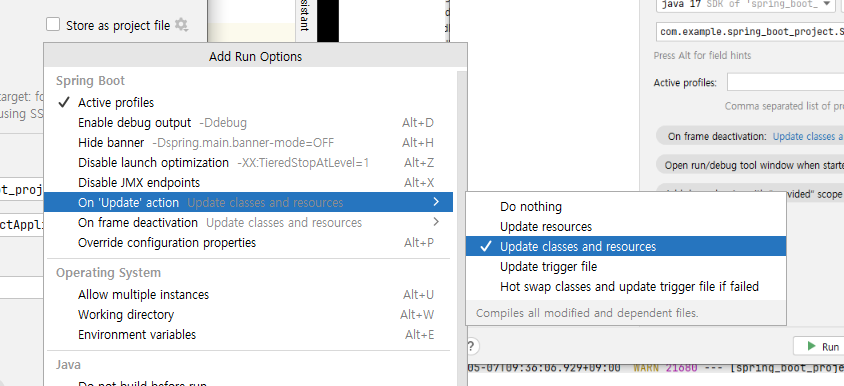 - 위에 두 항목에서 Update classes and resources를 추가하고 OK