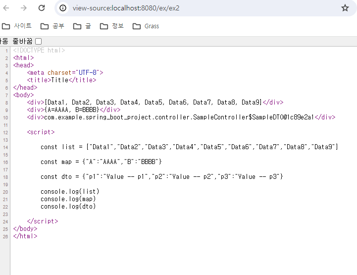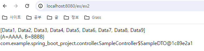 - SampleController에 내부 클래스로 SampleDTO와 ex2 Model 생성