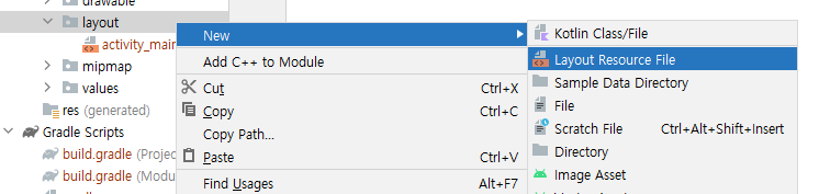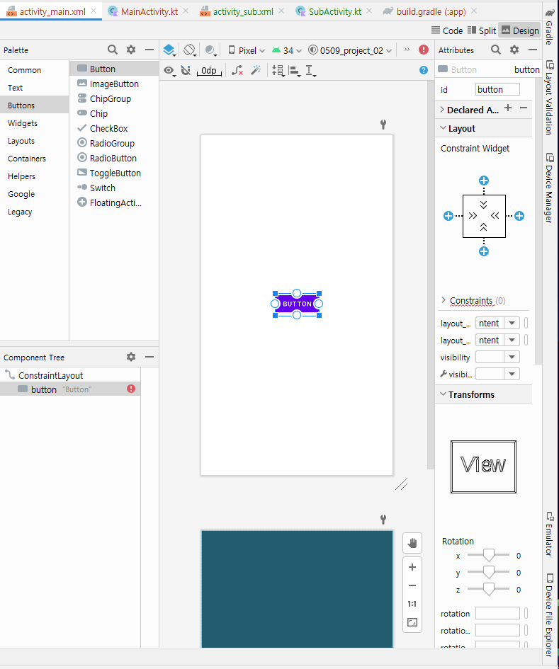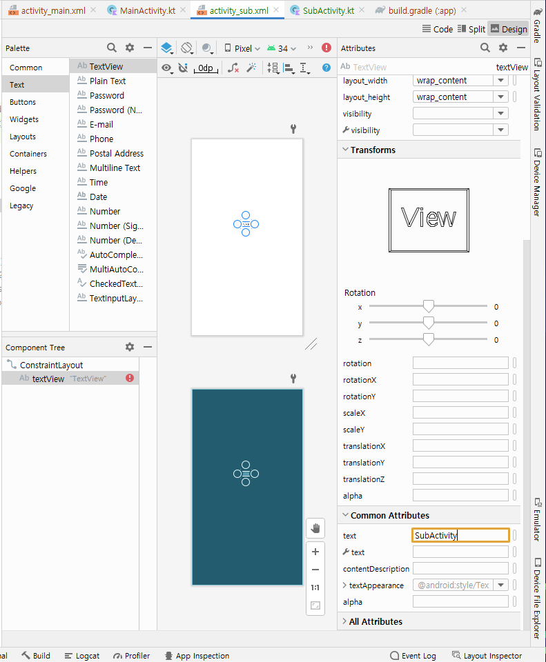 - activity_sub.xml에 Textview 추가 후 > text 변경