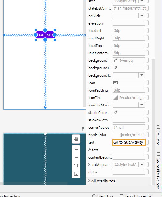 - 오른쪽 Attibutes 탭에서 버튼 Text 내용 변경