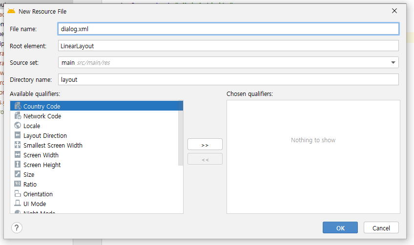 - 프로젝트 새로 생성 후 > dialog.xml 파일 추가