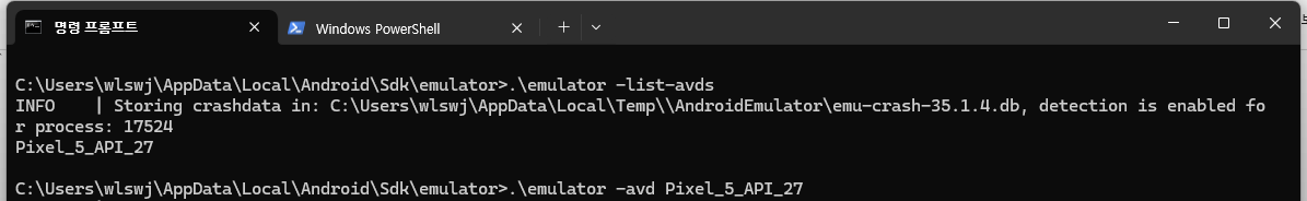 - [ .\emulator -avd (에뮬레이터 이름) ] 을 명령어로 입력하면 실행됩니다.