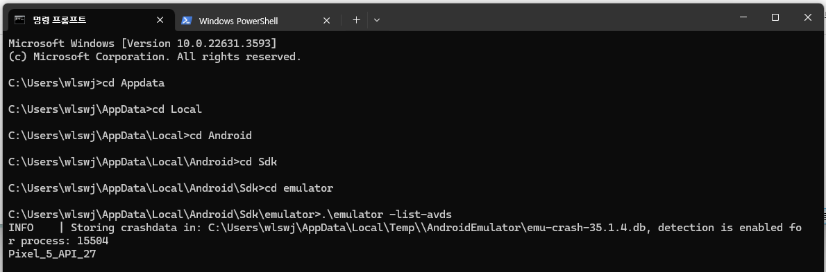 - emulator 폴더 경로까지 도착한 후에 [ .\emulator -list-avds ]를 입력해줍니다.