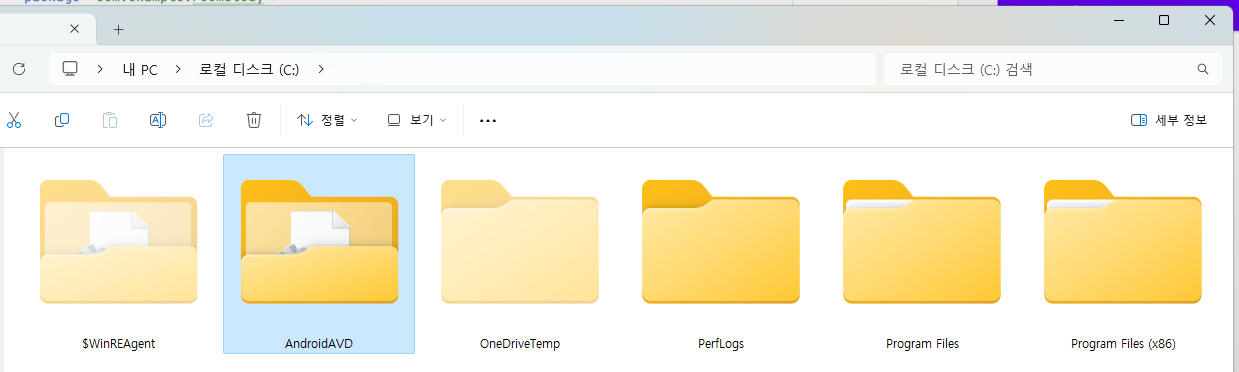 로컬 디스크 (C:)에 [AndroidAVD] 라고 새로운 폴더를 만들어줍니다.