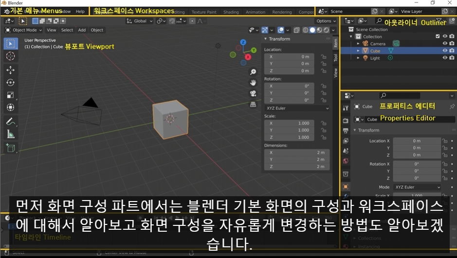 블렌더에 화면에 대한 설명과 기본 메뉴 설명.