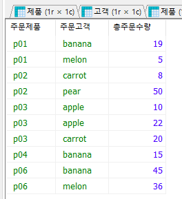 SELECT 주문제품, 주문고객, SUM(수량) AS 총주문수량 FROM `주문` GROUP BY 주문번호 ORDER BY 주문제품, 주문고객;