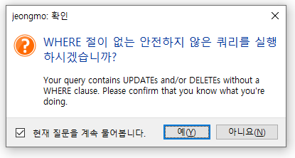 # 만일 실수로 WHERE 절을 뺄 수 있는데, 이 경우 모든 데이터가 변경한느 사고가 발생