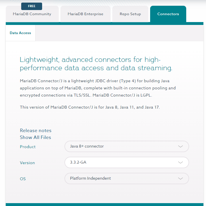 - https://mariadb.com/downloads/connectors/ 접속 > JAVA 8+ 설정 > 다운로드