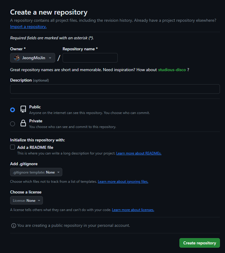 - Descroption : 저장소 설명 (필수 아님)