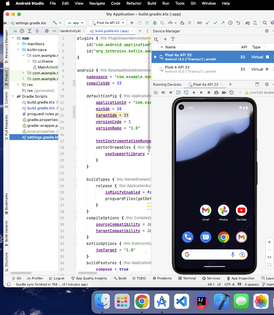 - Virtual Device Manage > Pixel 4 a 33 생성 > 실행