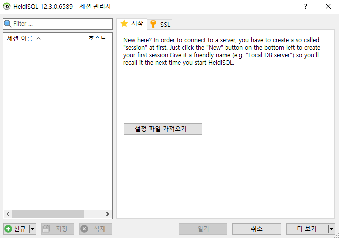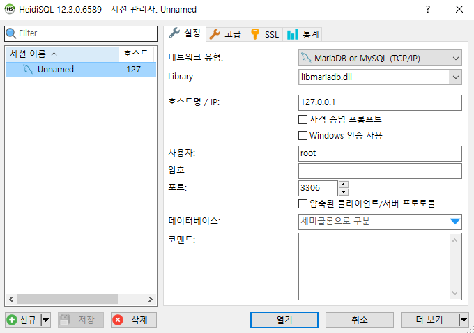 3. 신규 > 세션 이름 변경, 비번 입력 후 [열기] 클릭