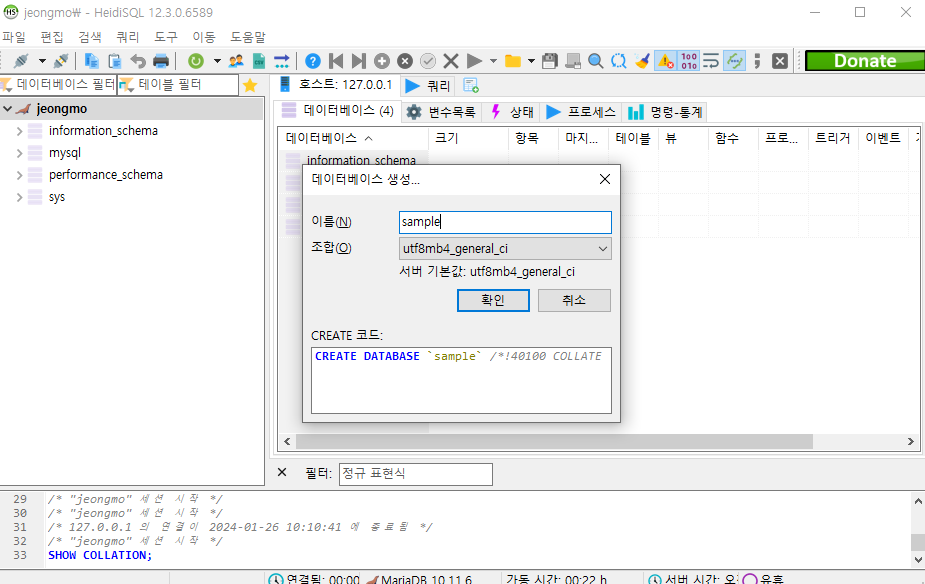 4. 세션 우클릭 > 데이터 베이스 새로 생성 > 이름 설정 > 조합 utf8 확인 > 확인
