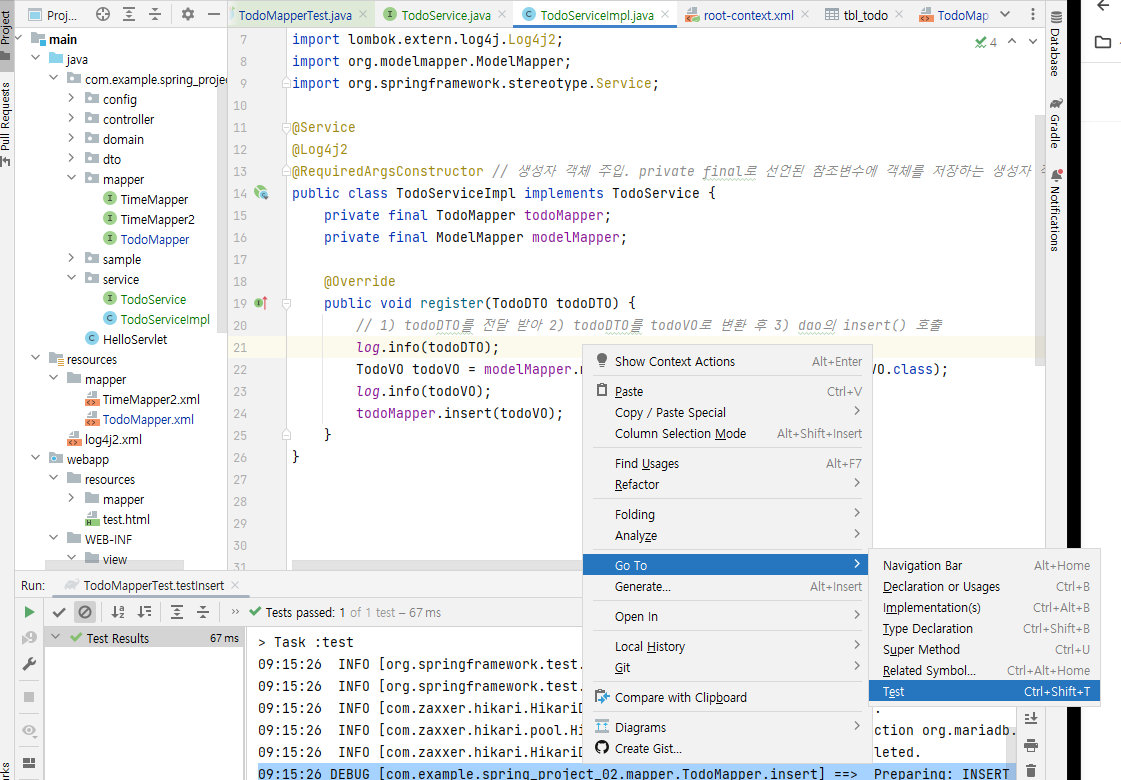 - TodoMapperTest에서 testInsert 작성 후 실행