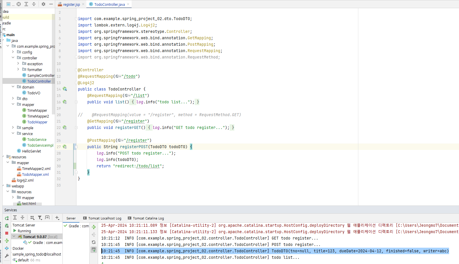 Spring (Todo 기능 개발, TodoService와 TodeServiceImpl 클래스, register 폼 작성, 한글 처리 필터, @Valid 유효성 검증, JSP 검증 메시지 확인, Todo 목록 기능 개발, TodoController의 처리)